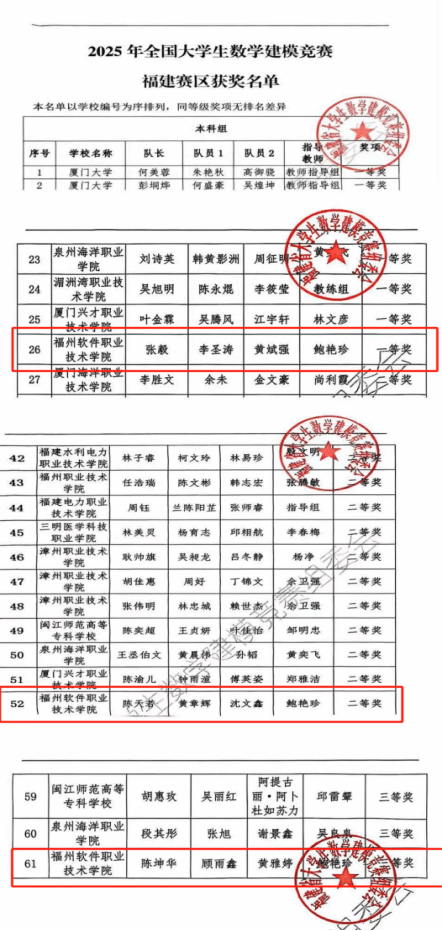 2025 年全国大学生数学建模竞赛于 2025 年 9 月 4 日至 7 日 举行,由厦门大学等56所省内高校组织了2087队伍参加了竞赛。经专家评审、竞赛组委会审定,由通识教育中心鲍艳珍老师指导的学生在本次数学建模竞赛福建赛区斩获专科组一、二、三等奖各一项,创下我校参赛以来的最好成绩: