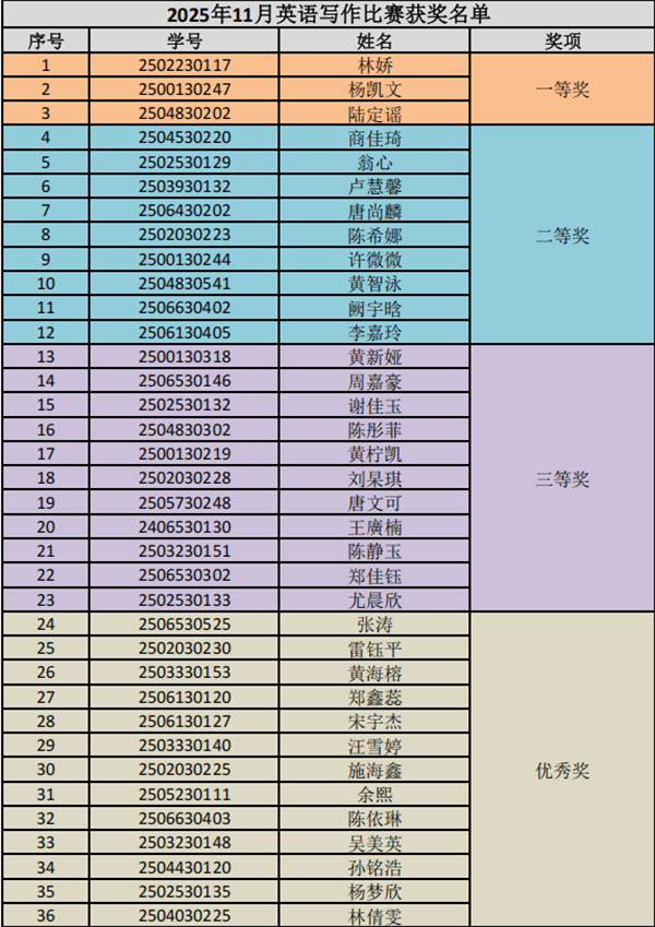 图3为2025年11月英语写作比赛获奖名单