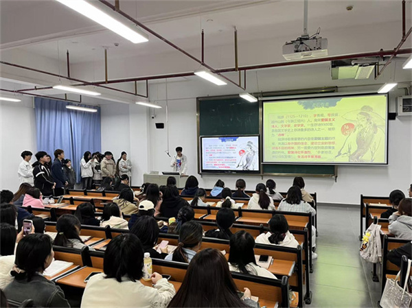 此次汇报围绕《少年中国说》与《诗歌》两个章节展开,重点探讨了爱国主题。汇报前,同学们进行了充分的小组讨论,每组8-9位同学,自由选择研讨方向,深入挖掘经典文学作品中的爱国情感。汇报现场,各组代表依次上台,通过PPT、视频展示等多种形式,生动展现了各自的学习成果。