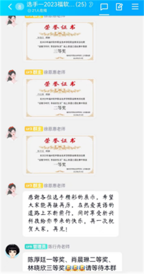 经评委统分审定后,本次活动主持人徐恩惠老师依次公布了一、二、三等奖名单,选手和老师们纷纷表示祝贺。活动结尾,外语教研室主任陈行舟老师对本次活动进行点评致辞。一方面,她对本次活动成效给予了极大的肯定,强调这不仅是一场技能的较量与展示,更是一次帮助学生提升语用能力,展现精神风采的舞台,希望各位同学继续保持昂扬斗志和青春朝气,形成百舸争流,创先争优的良好学习氛围。另一方面,她也指出,外语教研室和大学英语课程教师应该积极以此为契机,坚持以赛促教,以赛促改,以赛促建,形成共识,知行合一,倒逼推动职业教育成果向高质量发展。